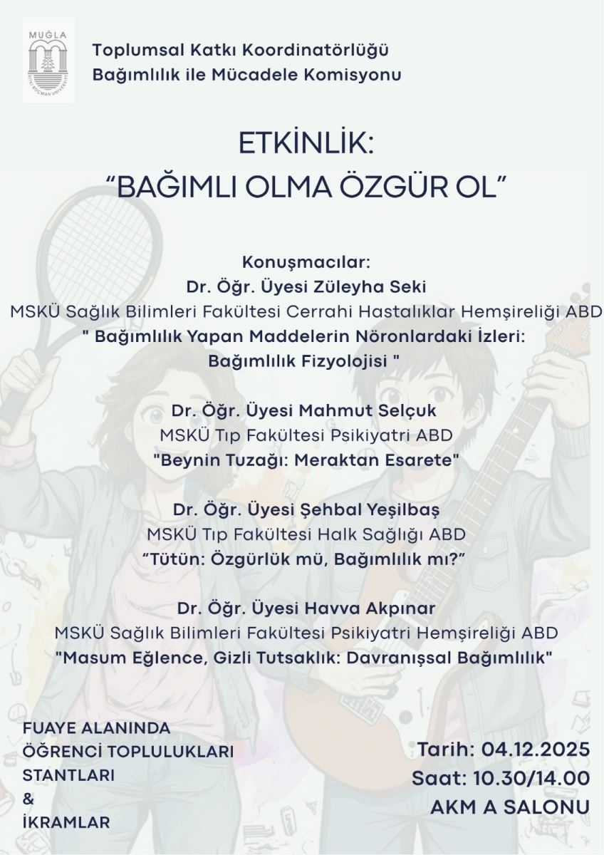 Bağımlı Olma Özgür Ol "Bağımlı Olma Özgür Ol" konulu etkinlik 4 Aralık 2025 Perşembe günü Atatürk Kültür Merkezi 15 Temmuz Demokrasi Şehitleri Salonunda 10.30-11.30 saatleri arasında gerçekleşecektir. Tüm öğrencilerimiz davetlidir. Son Güncelleme : 21.11.2025 16:12 Okunma Sayısı : 6